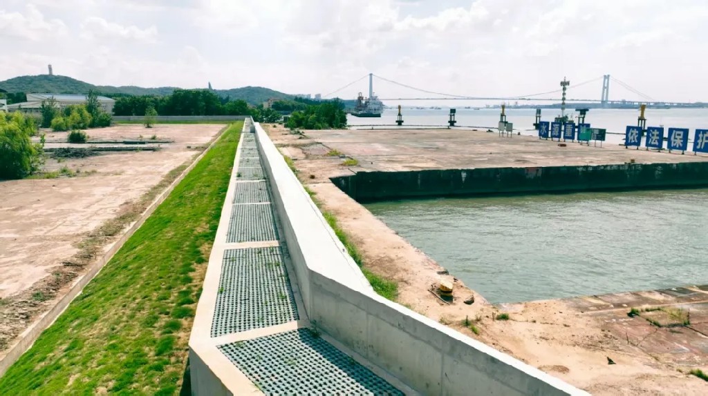 在肖山水廠至中糧集團段,394米空箱擋墻如鋼鐵臂膀環(huán)抱江岸,7.7米墻頂高程筑起Ⅱ等防洪屏障,巡視平臺與鋼爬梯構(gòu)成安全監(jiān)測網(wǎng)絡;170米L型防洪墻以化學植筋技術(shù)縫合新老駁岸,5米拋石帶化解沖刷威脅。兩座活動防洪墻如同"防汛開關(guān)",讓2級堤防既具剛性防御,又富柔性智慧。這項工程不僅填補了主江堤缺失段,更用鋼筋砼的現(xiàn)代筆觸,在長江之畔書寫了"擋洪交圈"的安瀾答卷——昔日堆場蛻變?yōu)槭刈o一方的生命防線,讓母親河與城市共繪人水和諧新畫卷。